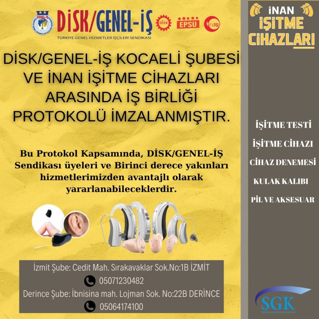 Disk/Genel-İş Sendikası üyeleri ve birinci derece yakınları, İnan İşitme Cihazları’ndaki hizmetlerimizden avantajlı olarak yararlanabileceklerdir.